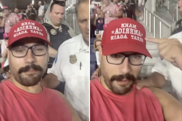 Home Scandal and Gossip Fan wearing MAGA hat escorted out of St Louis stadium cause of...