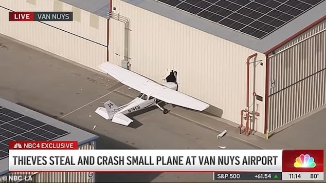 A thief allegedly broke into Van Nuys Airport around 4am and hijacked a single-engine Cessna, before crashing it into a building, KNBC reported.